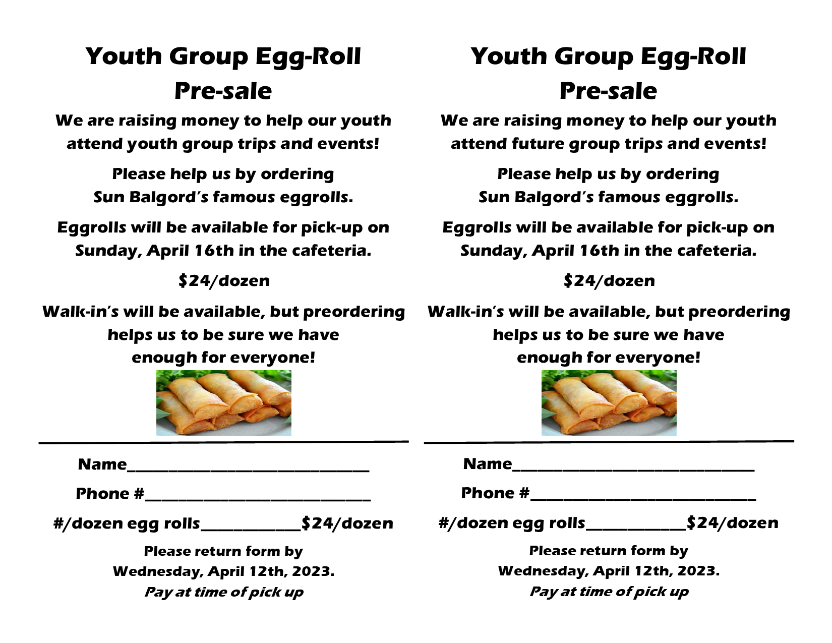 Eggrolls will be available for pick-up on Sunday, April 16th in the cafeteria.