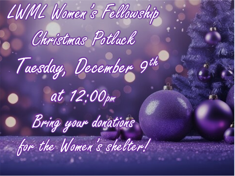 LWML Women’s Fellowship will meet for our Christmas Potluck on Tuesday, December 9 at 12:00pm noon in the Parlors.