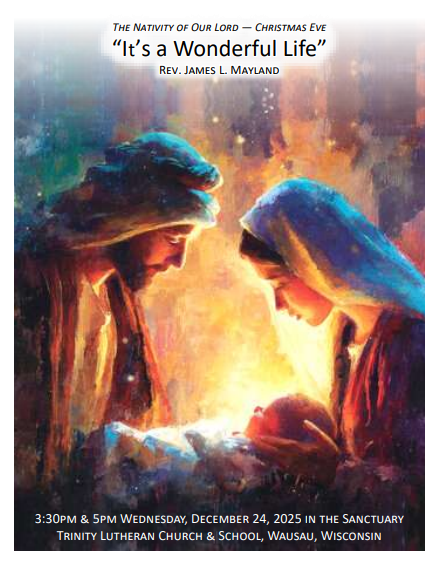 Christmas Eve Trinity Lutheran Church & School December 24, 2025 0 Comments Category Worship Like Tweet +1 Pin it Write a comment: Cancel replyCommentName * Email * Website Your email address will not be published. Save my name, email, and website in this browser for the next time I comment. Δ