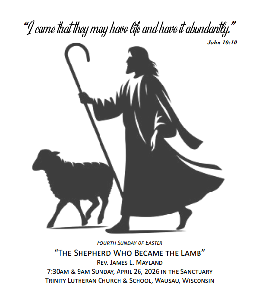 Fourth Sunday of Easter Trinity Lutheran Church & School April 26, 2026 0 Comments Category Worship Like Tweet +1 Pin it Write a comment: Cancel replyCommentName * Email * Website Your email address will not be published. Save my name, email, and website in this browser for the next time I comment. Δ